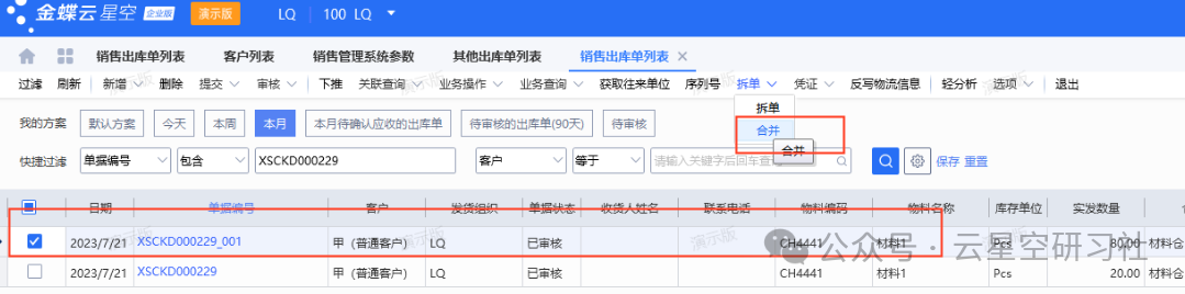 这时候,一张销售出库单对应多张发票,财务和业务都对不上,对账时头疼不已。图1图2系统会自动生成一张“原单号+001”的子单。如图3:图3之后,不同的子单分别下推应收单,结算、开票就能一一对应了。如果后期客户又说不分开了,也没关系——选中带后缀的子单,点击“合并”,就能回到合并状态,如图4:图4