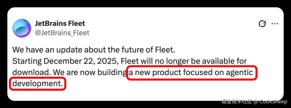 去年底 Fleet 官宣落幕的时候,官方曾明确表态,Fleet 虽然倒下,但是其背后的技术和团队并不会消失,JetBrains 将基于该基础,转而押注 Agentic Development 赛道,去开发一个新的产品