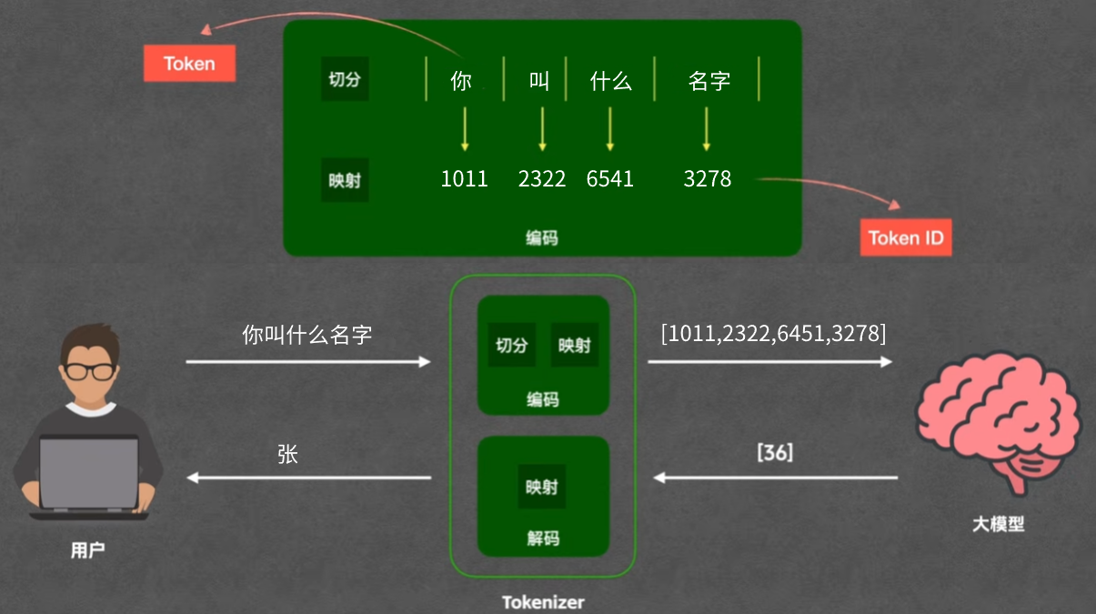 你给大模型提一个问题,用自然语言描述了一句话,比如“你叫什么名字”,这句话会先交给 Tokenizer 处理,它要把这些文字转换成数字 需要分两步: