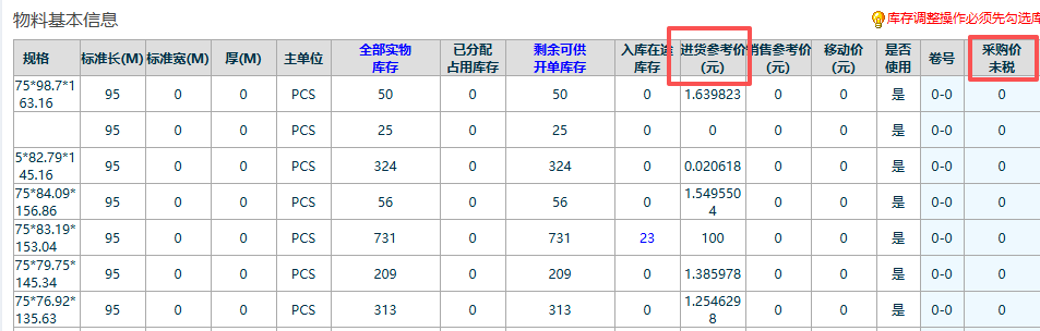 点晴模切ERP--物料库存查询的进货参考价有显示,但是采购价未税显示为0是怎么回事?