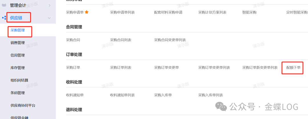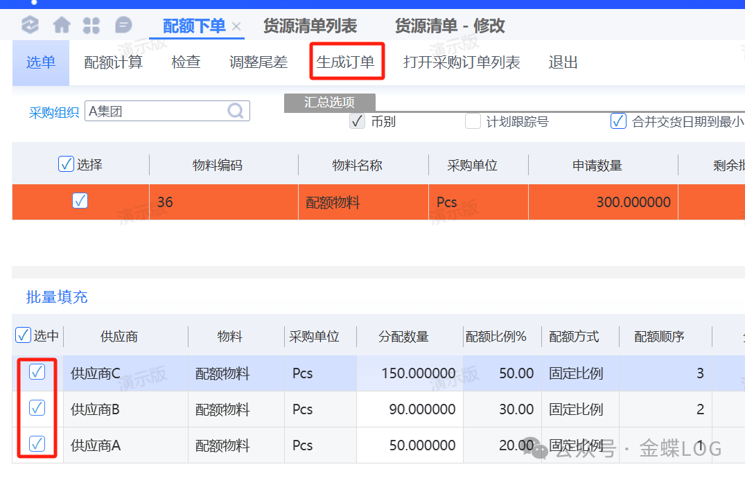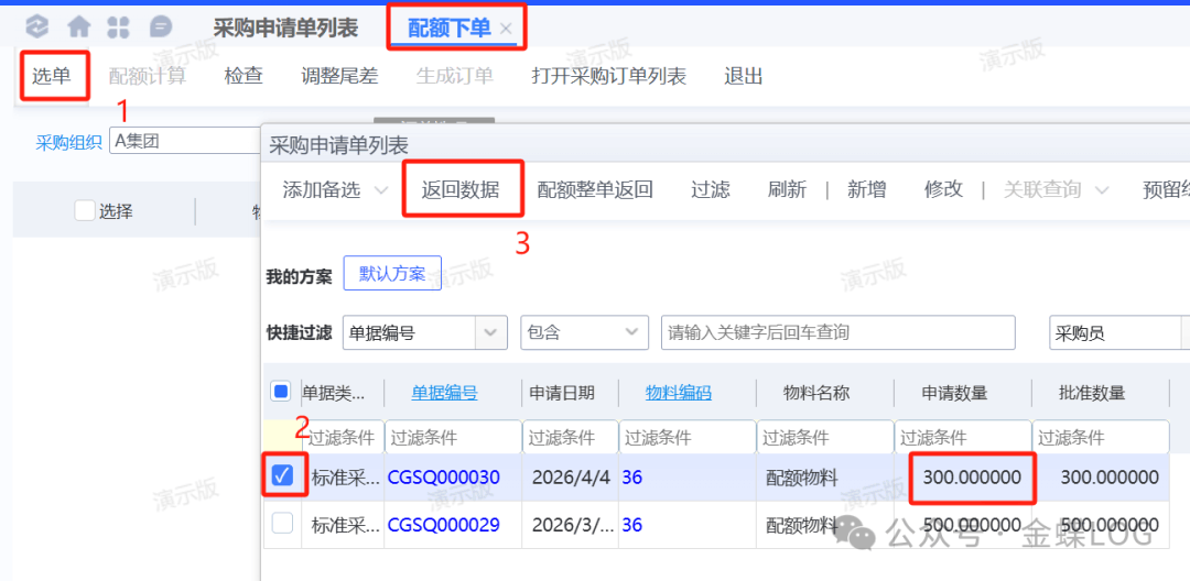 基础资料配置完成后,即可对采购申请单执行配额下单。
