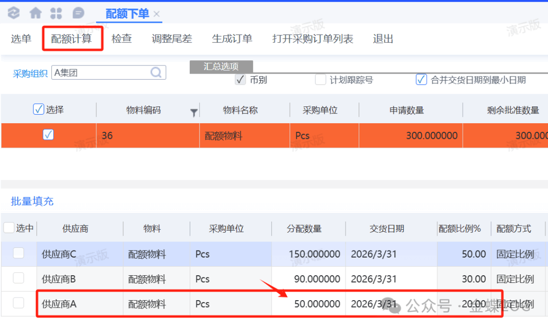 • 配额计算勾选需要配额的物料,点击【配额计算】,系统会根据前面的货源配置计算结果: