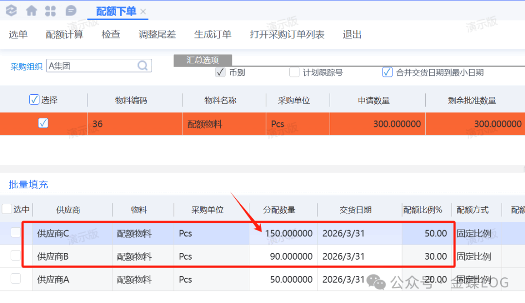 "固定比例"配额方式为配额下单的其中一种。它的逻辑是按货源清单上供应商的【配额比例】,依次分配申请采购数量,直到每个供应商达到其最大订货数量为止