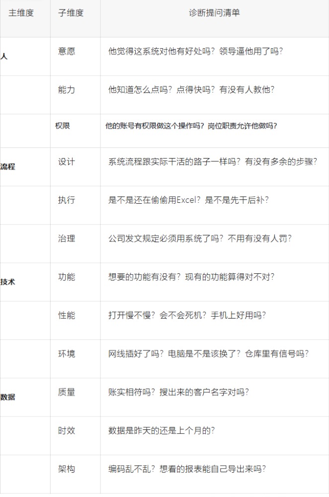 这四个变量像钻石的四个顶点,相互依赖、相互影响。改变其中一个,必然牵动其他三个。如果只改技术,而任务、人员、结构纹丝不动,变革注定失败。 二、四个维度还是太粗?用MECE原则切下去1. 人的因素:意愿 vs 能力人的问题,归根结底就3个:想不想做,会不会做,能不能做。三者互不重叠,加起来就是人的全部。 意愿(主观能动性)——想不想做认知层:员工理解为什么要上ERP吗?知道系统能带来什么好处吗? 利益层:系统对他个人是威胁还是帮助?用了是扣钱还是发奖金? 情感层:是不是习惯了过去的方式,对新系统本能地抵触? 能力(客观条件)——会不会做知识层:培训到位了吗?知道每一步该点哪里吗? 技能层:知道步骤,但在业务繁忙时能熟练操作吗?( 生理/认知极限:比如年龄大的员工打字慢,或者视力问题影响操作 权限(组织边界)——能不能做角色权限:系统账号是否配置了相应的操作权限? 职能权限:岗位职责是否允许他执行这个操作? 资源权限:是否有权调动完成任务所需的资源(数据、人员、设备)? MECE检验: 一个人想做、会做,但没有权限 →权限问题 一个人想做、有权限,但不会做 →能力问题 一个人会做、有权限,但不想做 →意愿问题 三者互斥(意愿、能力、权限是三个不同的维度),且加起来就是“人”的全部:任何一个人的行为受阻,必然是因为这三个原因中的一个或多个。 在经典的莱维特钻石模型中,“权限”其实被归入了“结构”(Structure)维度——组织的权责分配、沟通机制和权力层级。 在ERP系统中,“权限”往往是“流程治理”的一部分(谁有权审批、谁有权修改),但也直接作用于“人”——一个操作者即便意愿和能力兼备,如果账号权限没配好,照样动弹不得。 2. 流程的因素:设计、执行、治理流程的问题可以从三个层面看:路有没有修好,大家有没有走路,有没有人指挥交通。 流程设计(逻辑层)匹配度:系统里的流程和实际业务场景一致吗?比如公司常有紧急采购,系统却要求必须走三天招标流程 合理性:流程有没有冗余节点?比如需要三个人审批,但第三个人经常出差,流程就卡住了 闭环性:流程有没有反馈?录了数据,能不能看到结果? 流程执行(操作层)bypass率:有没有线下纸质单和线上并行?有没有绕过系统的“潜规则”? 合规性:是否严格遵守系统路径?比如先斩后奏、事后补单 流程治理(制度层)制度保障:公司有没有明文规定“不走系统怎么处罚”? 权责分明:每个节点的负责人清楚自己的职责和时限吗? MECE检验:流程问题要么是“路没修好”(设计),要么是“有路不走”(执行),要么是“没人指挥交通”(治理),三者互斥且穷尽。 3. 技术的因素:功能、性能、环境技术问题往往被简单理解为“软件有bug”,但其实它包含三个独立的方面:能不能做、做得快不快、在哪儿跑。 功能(做什么)完整性:系统有没有这个功能?是不是需要二次开发? 正确性:功能有,但算出来的数对不对?逻辑有没有bug? 易用性:操作是否便捷?比如需要点5次才能完成,能不能优化成1次? 性能(快不快)响应速度:点击后几秒加载?超过3秒用户就容易烦躁 稳定性:会不会闪退、卡死?并发量大时会不会宕机? 兼容性:在不同浏览器、不同手机上表现一致吗? 环境(在哪跑)网络基建:服务器部署在哪?分公司带宽够吗?仓库里有WiFi信号吗? 硬件设施:电脑配置是不是太低了?扫码枪、打印机适配吗? MECE检验:技术问题要么是“做不到”(功能),要么是“做得慢”(性能),要么是“环境不允许跑”(环境),三者边界清晰。 4. 数据的因素:质量、时效、架构数据是ERP的血液,数据问题可以拆成:准不准、新不新、好不好用。 数据质量(准不准)准确性:系统里的数据和实物/账目一致吗?比如库存数量对不对? 完整性:必填字段都填了吗?有没有大量空值? 一致性:同一个客户,销售部和财务部的名称一样吗?(比如“IBM”和“IBM中国”) 数据时效(新不新)及时性:数据是业务发生时录入的,还是隔天补录的? 周期性:月结、年结能按时完成吗?数据会不会滞后? 数据架构(好不好用)标准化:编码规则统一吗?物料编码是数字还是乱码? 可获取性:用户能方便地从报表获取数据吗?还是每次都要找IT导出? MECE检验:数据问题要么是“脏”(质量),要么是“旧”(时效),要么是“乱”(架构),三者互斥且全面。 实战清单:当你坐在客户面前现在,我们把所有维度汇总成一张快速筛查表。下次客户说“系统没用起来”,你可以一边听,一边在心里默默过一遍这些问题: