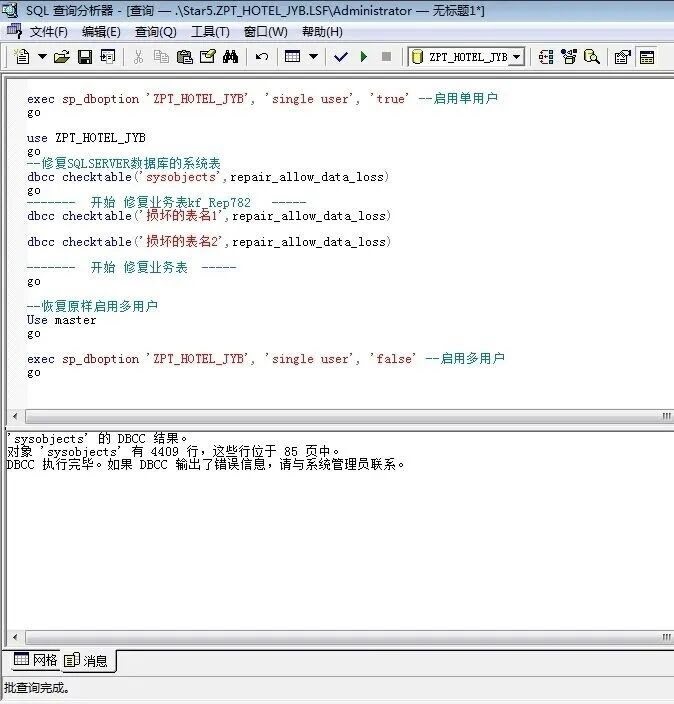 表结构损坏,表现方式是软件突然发生“莫名其妙”的问题: 如:如酒店系统的突然不能开房,或不能结账,或不能夜审,或不能查看某一个报表。反正用到某个表的某个功能,就不能操作。 但其他功能一切正常,而且数据库也没有置疑。 过去在ERP管理系统开发的这些年中,处理过几次这种情况。这种问题,单从软件上,很难找到原因。后面几经折腾,才找到原因: 原来是Sqlserver数据库中某一个或几个表损坏。 一般是因为断电、或前台人员强行关机、强行关闭软件(特别是当管理软件正在进行夜审、结算等大量的数据运算时)。 现把处理此情况的方法总结如下,希望对大家有用。 注意:下文中,ZPT_HOTEL_JYB是我所用的数据库名称,应用中,记得替换为实际的数据库名称: 第一步:检查并修复数据库,并找出哪个表损坏。 运行结果如上图。如有表结构损坏,损坏的表名会在“消息”页以红色的方式显示出来。