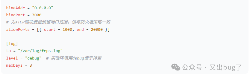 调试完毕后,请将frpstunserver的日志级别从debug调整为infowarn,避免日志过多。