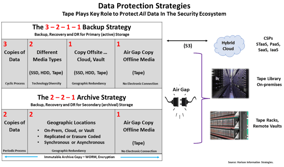 但实际上只有磁带、光盘这类可以实体移除、分离保存的抽取式储存装置,才能做到彻底的Air-Gap效果,也就是实体的离线(offline),通过网络将备份文件写入磁带或光盘后,就将这些存储介质取出,完全与前端生产环境断开,甚至断电,彻底确保攻击者无法接触与存取这些备份存储介质。