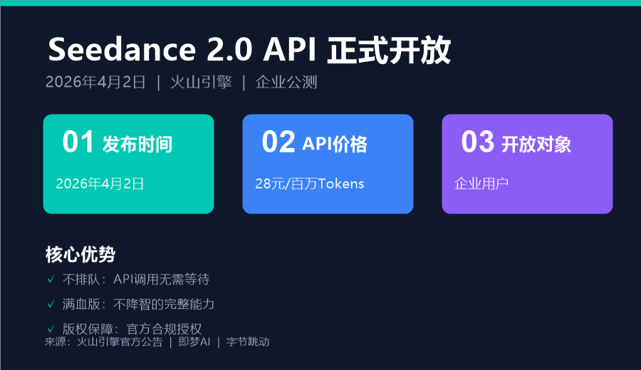 4月2日,火山引擎宣布Seedance 2.0 API正式面向企业用户开放公测。我看到消息的时候,还挺兴奋的。是不是意味着,我们终于可以不用排队了?第一,仅面向完成企业认证的主体。个人用户暂不纳入申请范围。第二,默认并发数锁定在10,不支持上调。这意味着你同时只能提交10个任务,对于高频创作来说,这个限制挺致命的。第三,真人人脸生成和自定义人像功能暂不开放,只能使用平台公共虚拟人像库。这对于需要保持品牌角色一致性的创作者来说,是个大问题。最关键的是第四点:想要解锁完整能力,需要签署保底合作协议,支付10%预付款及100万元保证金。我算了笔账。官方API的定价是:纯视频生成,每百万Token收费46元;含视频输入的编辑任务,每百万Token收费28元。一个15秒的1080p视频约30万Token,差不多14-15元。换算下来,生成1秒视频约1元人民币。这个价格其实挺有竞争力的。比OpenAI的Sora便宜5-10倍,比国内其他模型也便宜不少。字节跳动又一次用了和豆包大模型相同的策略:先把价格打到行业最低,用规模撑起基础设施的效率,再反过来压低单位成本。这个策略,字节用得很顺手。豆包大模型的日均Token已经超过120万亿,这个数字还在三个月翻一倍,挺猛的。所以API开放,对个人创作者和小团队来说,并不是真正的解药。我当时的想法是:既然官方和API都走不通,那我是不是该放弃Seedance 2.0了?但我发现,还有别的路