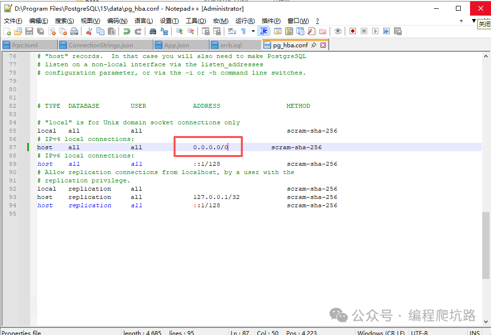 ✅ 到这里,PostgreSQL 已经安装成功! 🌐 三、开启远程连接(关键配置)默认只允许本机访问,按下面设置即可远程连接。 1. 修改配置文件找到 data 目录下的 pg_hba.conf ![]() 打开文件,找到 IPv4 配置,把地址改为: ![]() ![]() 2. 重启 PostgreSQL 服务配置修改后必须重启,才能生效。 ![]() 3. Windows 防火墙放行 5432 端口(Windows Server 必做,普通电脑建议也配置)