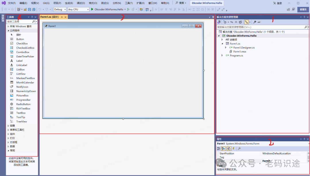 最早发明计算机主要是用于科学计算,利用计算机的高速运算能力代替人工计算以提高效率,应用范围主要集中在科学工作者以及专业从业人员那一小撮人群,那时侯的使用者主要关注数据,通常使用控制台操作计算并显示结果。而真正的让计算机由高端产品走进大众视野,则要从GUI程序的出现开始,它让程序从枯燥刻板的黑窗口进入到图形化时代,实现了一次划时代的飞跃。在软件发展历程中,Windows窗体编程占据着非常重要的地位,它不仅拓展了计算机的应用范围与场景,还让人们对计算机产生了非常浓厚的兴趣,进而衍生出了更多的生态与产业。到今天为止,各种各样的编程形式层出不穷,如Web,Android,Windows Forms,WPF等等,都是GUI图形化编程的不同形态。今天我们主要讲解的是基于.NET的Windows窗体编程,仅供学习分享使用,如有不足之处,还请指正。 ![]() 概述创建Windows窗体应用打开Visual Studio,点击“创建新项目(N)”打开创建新项目向导页面。 ![]() 在打开的“创建新项目”向导页面,选择“Windows窗体应用”项目模板,它包含两个模板:一个基于.NET的Windows窗体应用模板,一个是基于.NET Framework的Windows窗体应用模板。在此我们选择第一个,然后点击“下一步”,打开“配置新项目”对话框。 在“配置新项目”对话框,输入项目名称,如Okcoder.WinForms.Hello,以及项目保存位置,然后点击“下一步”,打开“其他信息”对话框。 ![]() 在“其他信息”对话框中,选择应用程序目标框架,在此默认选择“.NET8.0(长期支持)”,也可以通过右侧的下拉箭头进行修改,然后点击“创建”按钮 ![]() 应用程序创建成功后,在Visual Studio中,主要包含4个重要组成部分,分别如下所示:
