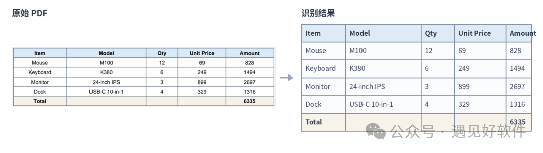 对这类需求来说,Tabula 的价值很直接:省掉手抄表格这一步。 真实效果到底怎么样?我专门拿了一页样例 PDF 跑了一遍,左边是原表格,右边是实际提取出来的结果表。