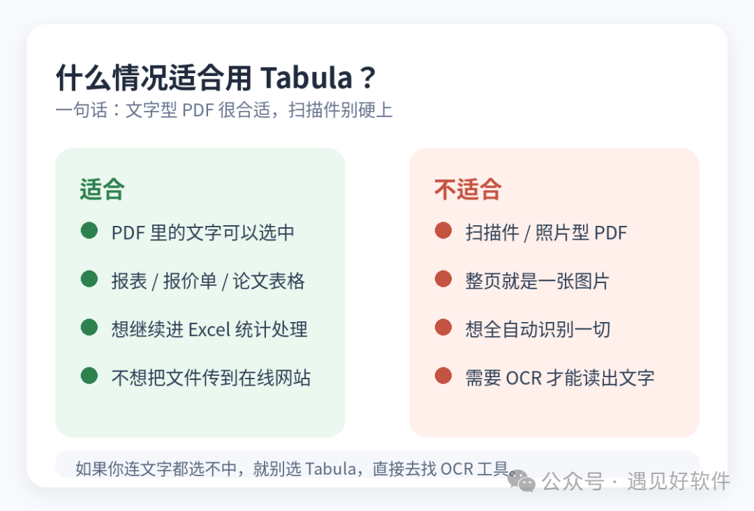 但真话也得说它不适合扫描件。 官方 README 和官网都写得很明白:Tabula 只适合 text-based PDF,不适合扫描版 PDF。也就是说,如果你的文件其实是一张图片塞进 PDF 里,那它大概率帮不上忙。那种情况应该去找 OCR 路线工具,而不是硬拿 Tabula 顶。 另外,它也不是那种还在高速迭代的新项目。官网显示当前稳定版还是 1.2.1,发布时间已经比较早;GitHub 上维护者也明确说过,主应用短期内不太会有大更新,更多是底层的 但这不一定是坏事。 因为 Tabula 的定位一直很清楚: 不是炫技,而是老老实实把 PDF 表格弄出来。 如果你要的是“把这份 PDF 里的表格先抠出来,后面我自己进 Excel 再整理”,它依然是个非常顺手的工具。 适合谁?✅ 经常处理 PDF 表格的人 ⚠️ 如果你处理的主要是截图、照片、扫描版 PDF,那应该去找 OCR 工具,不该选 Tabula。 怎么安装如果你只是想直接下载来用,不想研究 GitHub 页面,可以直接点官方发布地址: