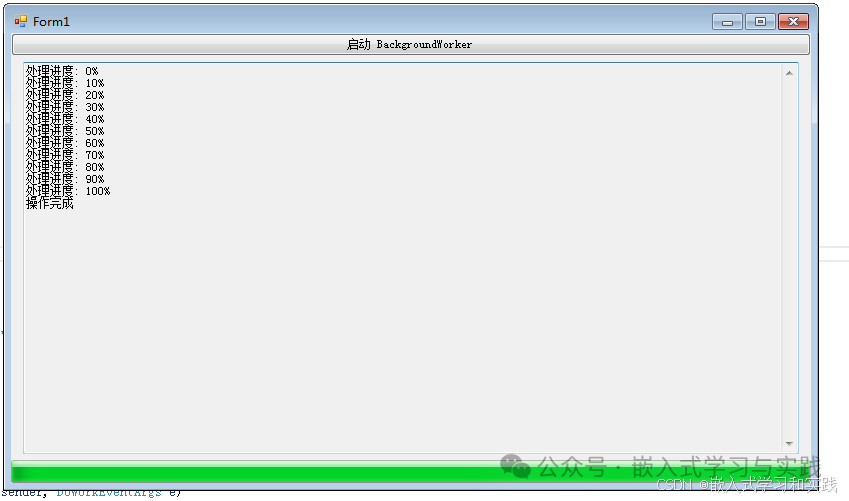 // 报告进度(线程安全)                worker.ReportProgress(i, $"处理进度: {i}%");            }        }        private void BackgroundWorker_ProgressChanged(object sender, ProgressChangedEventArgs e)        {            // 这些代码在UI线程上执行,不需要Invoke            progressBar.Value = e.ProgressPercentage;            textBoxLog.AppendText($"{e.UserState}\r\n");        }        private void BackgroundWorker_RunWorkerCompleted(object sender, RunWorkerCompletedEventArgs e)        {            btnStart.Enabled = true;