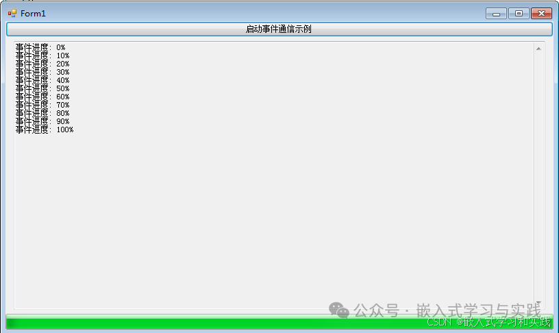 public partial class Form1 : Form    {        // 定义事件        public event EventHandler<ProgressEventArgs> ProgressUpdated;        public Form1()        {            InitializeComponent();            // 订阅事件            this.ProgressUpdated += OnProgressUpdated;        }        private void btnStart_Click(object sender, EventArgs e)        {            Thread workerThread = new Thread(new ThreadStart(WorkerWithEvents));            workerThread.IsBackground = true;            workerThread.Start();        }        private void WorkerWithEvents()        {            for (int i = 0; i <= 100; i += 10)            {                Thread.Sleep(400);                // 触发事件                OnProgressUpdated(thisnew ProgressEventArgs(i, $"事件进度: {i}%"));            }        }        // 事件处理方法        protected virtual void OnProgressUpdated(object sender, ProgressEventArgs e)        {            // 检查是否需要Invoke到UI线程            if (this.InvokeRequired)            {                this.BeginInvoke(new Action<object, ProgressEventArgs>(OnProgressUpdated), sender, e);                return;            }            // 在UI线程上更新控件            progressBar.Value = e.Percentage;            textBoxLog.AppendText($"{e.Message}\r\n");        }    }    // 自定义事件参数    public class ProgressEventArgs : EventArgs    {        public int Percentage { getset; }        public string Message { getset; }        public ProgressEventArgs(int percentage, string message)        {            Percentage = percentage;            Message = message;        }    }}