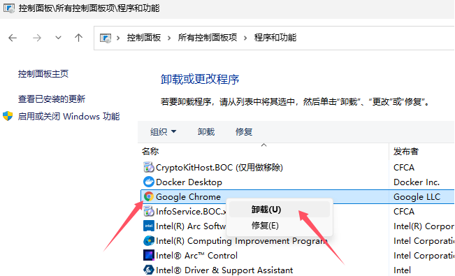 打开,找到“Google Chrome”,鼠标右键点击“卸载”: