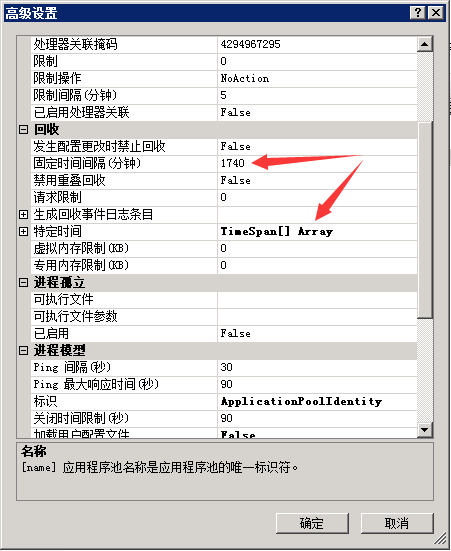[3] Recycling->Regular Time Interval设置为0(禁用应用程序池定期自动回收)