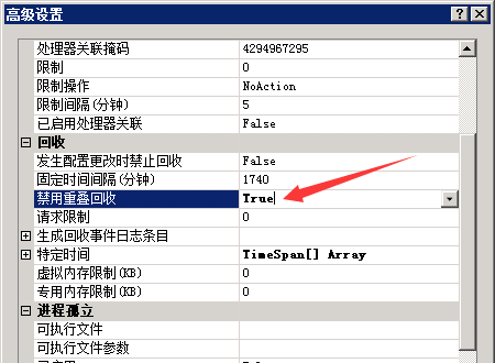 打开应用程序池 -> 高级设置 ->在“禁止重叠回收”里选择“true”,这样就有效避免了应用程序池回收假死问题。