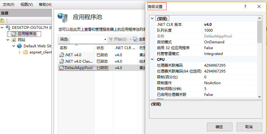 找到Web站点对应的应用程序池,“应用程序池” → 找到对应的“应用程序池” → 右键“高级设置...”