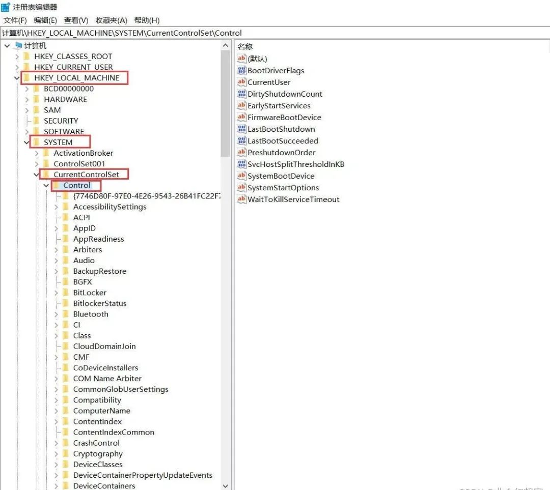 找到 HKEY_LOCAL_MACHINE \SYSTEM\CurrentControlSet\Control 并展开