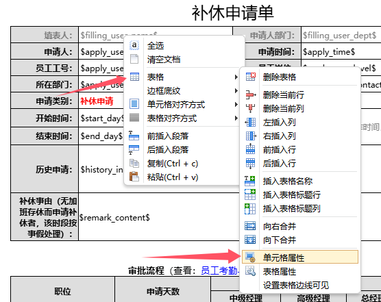 :请问工作流模板表格单元格背景色如何进行更改?![]() 找到需要更改表格背景色的单元格,点击鼠标右键,找到更改菜单: ![]() 点击单元格属性: ![]() 在背景颜色中,就可以更改单元格背景色了。
