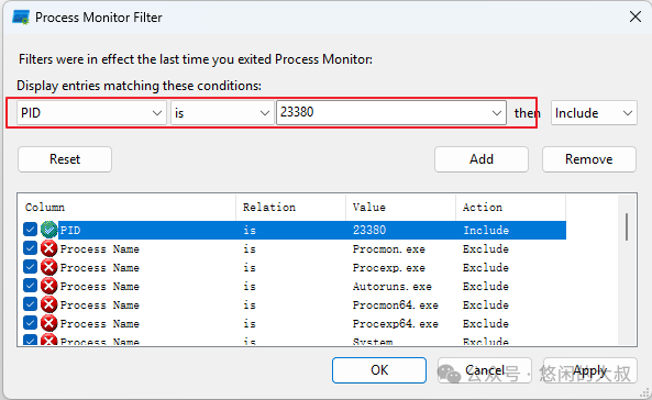 5.打开 Process Explorer,过滤器里选择 PID is “*****”。