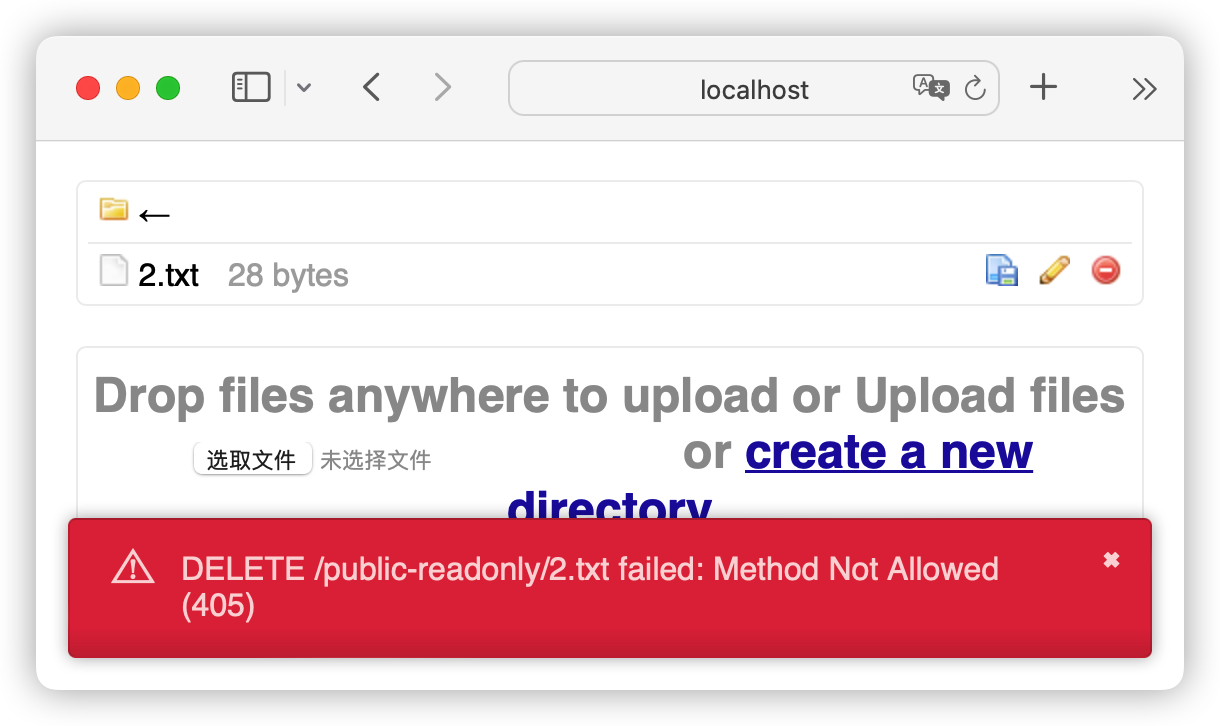 └── 1.txt使用浏览器访问 http://localhost:80,就可以看到 3 个不同的 GoWebDAV 服务了。 其中 http://localhost:80/public-writable 是 http://localhost:80/public-readonly 是 http://localhost:80/private-writable 是 当然,除了浏览器,也可以使用其他 WebDAV 客户端工具进行访问。 可以通过指定 ./gowebdav --help # 查看帮助