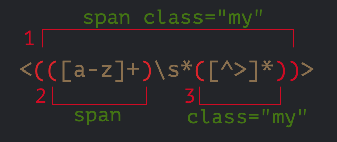 验证: let str = '<span class="my">'; let regexp = /<(([a-z]+)\s*([^>]*))>/; let result = str.match(regexp); alert(result[0]); // <span class="my"> alert(result[1]); // span class="my" alert(result[2]); // span alert(result[3]); // class="my"