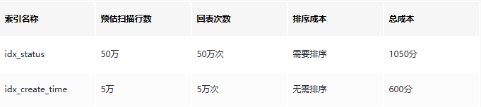 成本计算示例: 根据扫描行数、回表次数、排序成本,计算一个总成本的分数。 优化器会选择总成本更低的idx_create_time索引。 导致索引切换的四大真凶真凶1:数据分布变化场景还原: