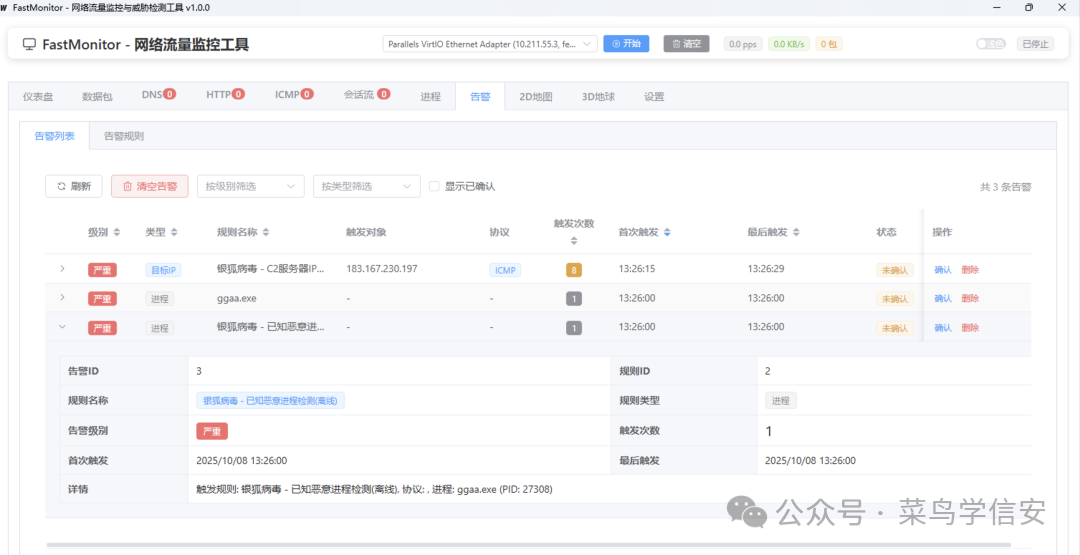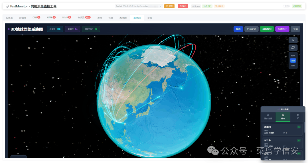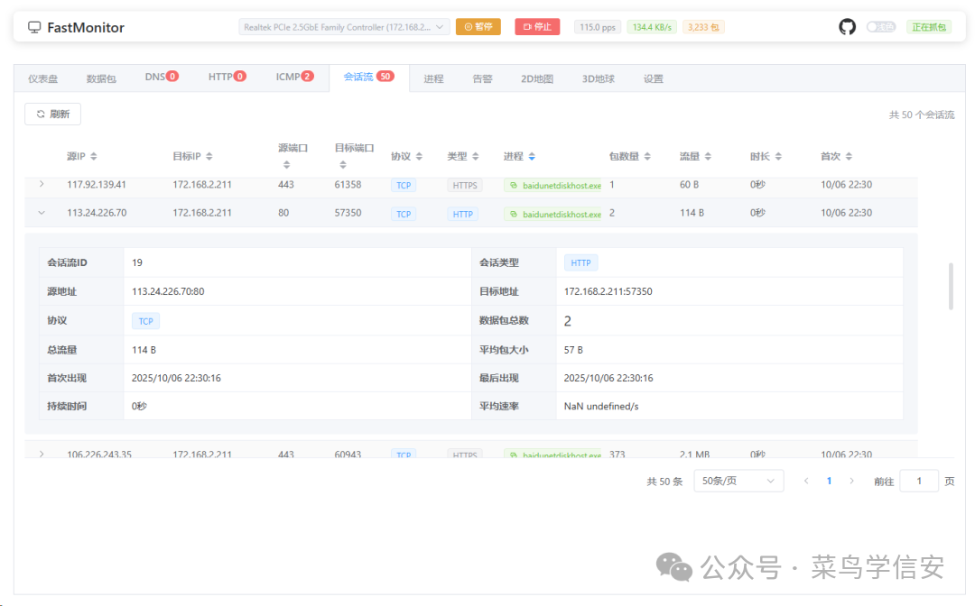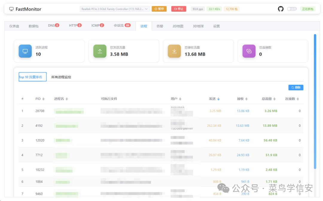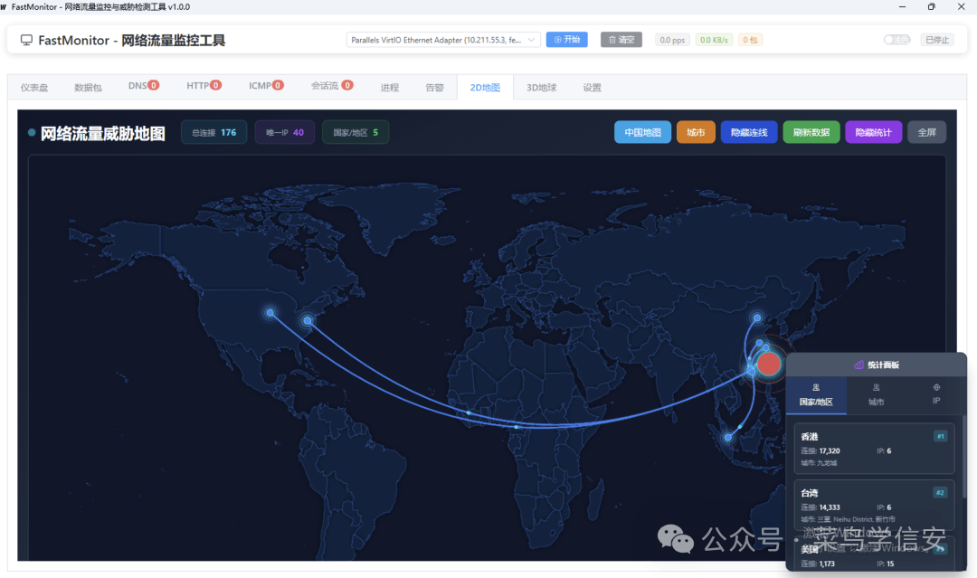 工具介绍 FastMonitor 是一款基于 Wails 框架开发开源的跨平台网络流量监控与威胁检测工具,集成了数据包分析、进程关联、会话流统计、威胁情报检测、地理位置可视化等功能于一体。 核心特性