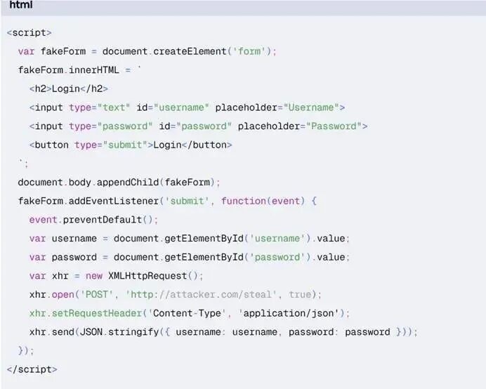 5. 发起网络钓鱼攻击 攻击者可以通过XSS攻击在页面中插入虚假的表单或链接,诱导用户输入敏感信息。 示例代码: