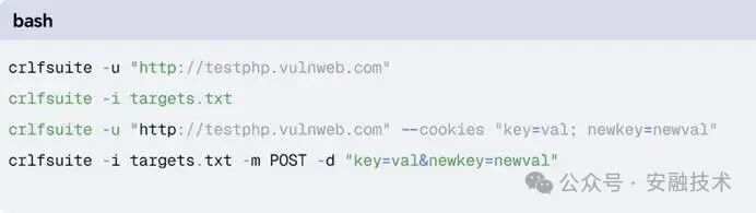 • 检查响应:如果服务器响应中包含了注入的头信息(如Set-Cookie: a=1),则可能存在CRLF注入漏洞。 2. 自动化检测工具: • CRLFsuite:一个自动化检测CRLF注入漏洞的工具。 • 安装:
