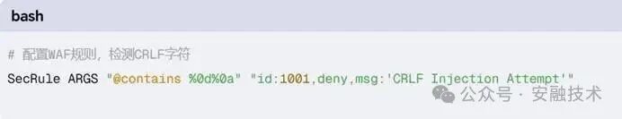 3. Web应用防火墙(WAF): • 配置WAF规则:通过配置WAF规则,检测和阻止包含CRLF字符的恶意请求。 • 示例: