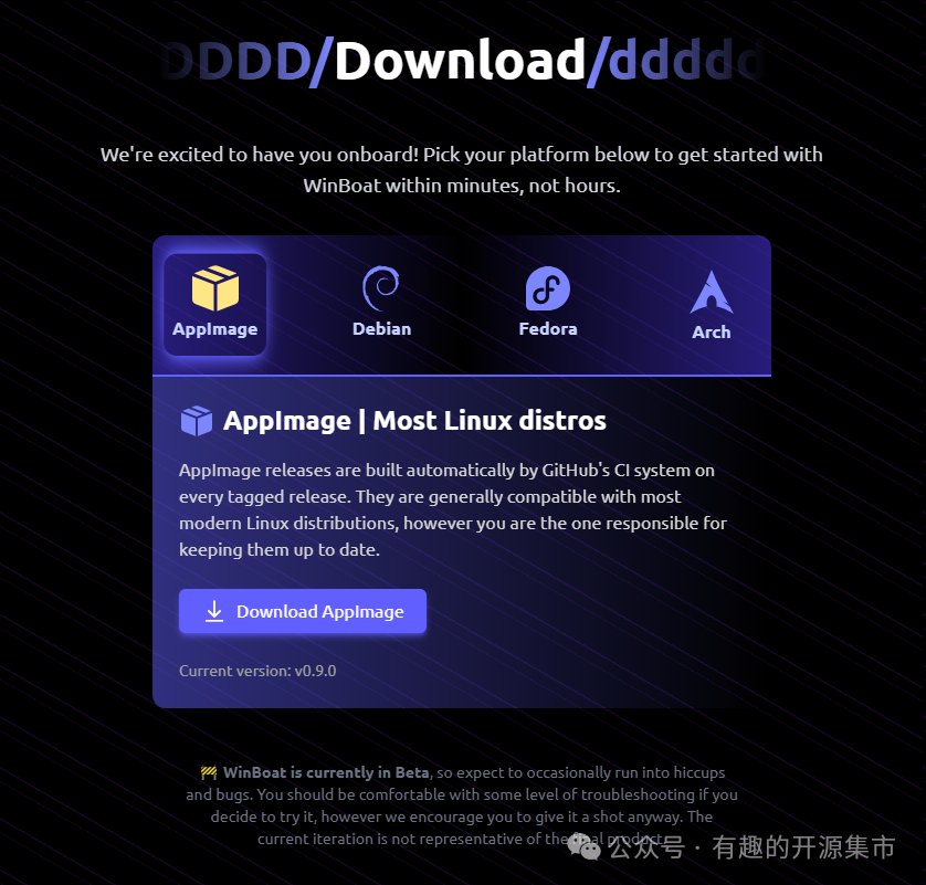 将用户添加到docker组,以便无需sudo即可运行Docker命令。AppImage:流行且便携的应用程序格式,大多数发行版都能运行。Unpacked:原始未打包文件,直接运行可执行文件(linux-unpacked/winboat)。在Releases页面下载最新的Linux构建版本。目前提供以下四种格式:运行 WinBoat根据下载的格式,运行相应的文件即可启动WinBoat。启动 WinBoat 后,你可以通过界面选择并运行任何 Windows 应用程序。WinBoat 会自动处理所有兼容性问题,确保应用程序在 Linux 上正常运行。如果你需要访问完整的 Windows 桌面环境,可以在 WinBoat 中选择“完整桌面”选项。这将启动一个完整的 Windows 桌面,你可以在其中运行多个应用程序或执行其他 Windows 任务。WinBoat 会自动将你的 Linux 主目录挂载到 Windows 环境中,这意味着你可以轻松地在两个系统之间共享文件。只需在 Windows 中访问挂载的目录,即可访问 Linux 文件。WinBoat 提供了资源监控功能,你可以在界面上查看当前系统的资源使用情况,如 CPU、内存和存储空间。这有助于你更好地管理系统资源,确保应用程序的流畅运行。WinBoat 为 Linux 用户提供了一个无缝运行 Windows 应用程序的终极解决方案。无论是开发、办公还是娱乐,WinBoat 都能让你在 Linux 上享受到 Windows 应用程序的便利。安装简单,使用方便,性能卓越,WinBoat 是每一位 Linux 用户的必备工具。
