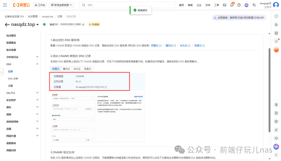 如何查看是否有IPV6呢?📱如图IPV6带有网关地址以及DNS地址的,那就是没问题的。 ![]() 开始实战原理其实就是让阿里云ESA使用IPV6回源我们相应的地址。 配置DDNS前端仔这里新购的域名,然后禁用了IPV4,只解析IPV6地址。 ![]() 通过域名+端口是能够访问到,说明DDNS已经生效了。 ![]() 配置ESA![]() 🥊 接入方式这里我们选择CNAME。与之前文章有点不同。 ![]() 🪀 手动将DNS记录添加到域名服务商处。(前端仔这里是阿里云的域名) ![]() 🎮 站点添加成功以后,进入站点添加一条DNS记录。 这里 ![]() 🔫 添加以后同样需要在域名服务商处添加DNS记录。 ![]() 添加一条回源规则,更改回源端口,这里我们填写上飞牛的端口。 ![]() 效果展示📛 前端仔为了方便,直接关闭了电脑的IPV6网络。 ✅ 使用域名访问,成功! ❓:访问速度怎么样? ✅:大家都很关心访问速度,没有备案的域名,个人而言,我能接受。备案后的域名,速度像坐火箭! ❓:使用ESA的前提是什么? ✅:需要一个域名以及拥有公网IP(IPV6即可)。 ❓:回源规则只能填5个怎么办? ✅:机器自己部署一个nginx、caddy或者lucky等web服务做反向代理,回源规则配置在这些服务开放的端口上。 阅读原文:原文链接 该文章在 2025/12/31 10:34:16 编辑过 |