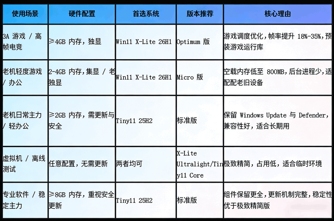Win11 X-Lite 26H1 与Tiny11 25H2精简版系统谁好用?在如今的数码圈,“轻量化”早已成为众多用户的核心诉求。无论是希望老电脑重获新生的普通用户,还是追求极致游戏性能的硬核玩家,都对原版Windows系统中冗余的预装组件、后台进程感到困扰,而第三方精简版系统的出现,恰好精准击中了这一痛点。近期,Win11 X-Lite 26H1 与 Tiny11 25H2 两款第三方精简版Windows系统更是强势出圈,成为大家热议的焦点——前者以游戏性能优化为核心卖点,宣称能大幅提升帧率、缩短启动时间;后者则凭借亲民的硬件门槛和接近原版的稳定性,收获了大批老设备用户的青睐。 随着两款系统的下载量持续攀升,关于它们的讨论也愈发激烈:有人说Win11 X-Lite 26H1的极致精简让游戏体验翻倍,也有人认为Tiny11 25H2的兼容性更适合日常使用;有人纠结于两者的安全风险差异,也有人关心不同配置设备下的适配表现。那么,这两款火爆的精简版系统到底哪个更值得选?它们在系统占用、性能表现、兼容性、安全性等关键维度上又有怎样的差异?今天,我们就带着这些疑问,为大家带来两者的详细对比,帮你根据自身需求做出最合适的选择。 ![]() Win11 X-Lite 26H1 与 Tiny11 25H2介绍 1、Win11 X-Lite 26H1介绍: Windows X-Lite 是由 NTDEV 团队开发的第三方定制精简版 Windows 系统,主打低资源占用、游戏性能优化与老旧设备适配,基于 Windows 10/11 官方核心深度精简,非微软官方发行Windows X-Lite。 Windows X-Lite团队发布基于Windows 11 26H1的轻量化定制系统,删减非必要组件并优化设置,显著降低内存与磁盘占用。Optimum版面向日常场景,兼顾性能与兼容;Micro及Ultralight版进一步精简服务,仅保留核心,适配旧PC与虚拟机,但删减幅度大,不推荐主力使用。团队宣称镜像“100%安全干净”,因其属第三方修改,安装风险需用户自担。 版本化分: 1、Optimum版本(日常 / 兼容性): 保留核心功能与兼容性,仅精简冗余组件,既能满足3A游戏高性能需求,又能流畅应对办公、直播等日常场景,是兼顾实用与性能的“万金油”。 2、Micro(旧机): 进一步删减非必要系统服务,仅保留最核心的运行模块,适合4GB内存、512GB SSD的老旧设备,最大化释放硬件潜力,让五年前的旧PC重新焕发战斗力。 3、Ultralight( 虚拟机): 极致精简所有非必需功能,仅维持基础系统框架,资源占用最低,专为虚拟机测试、低配主机专用游戏场景设计,不建议作为日常主力系统。 https://windowsxlite.com/downloads/ 网盘分流下载:https://pan.baidu.com/s/1paFkoNAVampk2DHysQ_TCg?pwd=if2q 2、Tiny11 25H2介绍: Tiny11 25H2 是由开发者 NTDEV 基于 Windows 11 25H2 官方镜像打造的第三方精简系统,2025 年 10 月发布,核心优势是突破硬件限制、大幅精简冗余、支持本地账户,分标准版与 Core 版,适配 x64 和 ARM64 设备,适合老电脑与轻量场景。 熟悉 Tiny11 的都知道,这是基于原版 Win 11 精简定制的一个更轻量、纯情、更省心的系统,曾受到无数用户青睐。而 Tiny11 25H2 则基于最新原版 Win 11 25H2 镜像打造。它直接砍掉了大量动不动就跑后台、占用资源、我们可能一辈子都用不上的功能和组件、一堆预装 App 以及各种奇奇怪怪的服务。 版本化分: 1、标准版(标准版):老电脑日常使用、轻度办公、娱乐 约8-10GB,核心移除Copilot、新 Outlook、Teams、Edge、Xbox 等预装应用,禁用部分遥测,保留 Windows Update,可获取累积补丁,部分功能更新可能失败。 2、Core版(极限精简版):虚拟机、离线设备、测试环境,不建议主力机使用 约 3-5GB,在标准版基础上进一步移除 Windows Update、WinSxS、Windows Defender(默认禁用)、WinRE 等,完全无更新能力,不支持系统更新与恢复。 夸克网盘分流下载:https://pan.quark.cn/s/40b67b4a3ece 百度网盘分流下载:https://pan.baidu.com/s/1-nZ0gUEPv1l5YqqS8-9wDw?pwd=hbnf 提取码: hbnf Win11 X-Lite 26H1 VS Tiny11 25H2从多个角度终极对比 Win11 X-Lite 26H1 是基于 Win11 26H1 打造的游戏向精简系统,资源占用更低、游戏优化更强,有多个版本可选;tiny11 25H2 基于 Win11 25H2,主打轻量化与基础兼容性,更新与安全机制保留更完整,适合老设备日常使用。 1、核心基础信息: Win11 X-Lite 26H1:Win11 X-Lite 26H1是由NTDEV团队2026年更新,版本分为:Optimum、Micro、Ultralight三个版本。 Tiny11 25H2:是由NTDEV团队2025年更新,版本分为标准版和Core两个版本。 2、功能精简对比: Win11 X-Lite 26H1是以深度精简系统组件、彻底关闭后台服务为核心手段,专为游戏玩家及高性能场景设计的第三方优化系统,专为与所有应用程序和游戏配合使用而设计,适用于所有电脑。无论新旧、配置高低、台式机还是笔记本电脑。 绕过 TPM、安全启动、内存、CPU 和存储检查,绕过 Microsoft 在安装/设置过程中强制创建帐户。 Tiny11 25H2主要亮点就是精简,开发者将系统里的各种冗余软件删除提高系统的运行效率,并且不需要满足 Windows 11 硬件要求(绕过 TPM 强制要求)和微软账号,这对于老旧 PC 来说也是个福音。 Win11 X-Lite 26H1: •游戏优化:内置智能资源分配引擎,优先分配 CPU 算力给前台游戏,暂停后台服务;预装 DirectX 全版本、VC++ 等运行库,解决游戏组件缺失问题;优化内存压缩和 DirectStorage 解压效率,缩短关卡加载时间。 •精简内容:砍掉 Cortana、Microsoft Store、Windows Defender(可选保留),禁用遥测、广告推送等,后台进程仅 49-62 个,空闲内存占用低至 1.1GB。 •账户与部署:支持离线创建本地账户,跳过微软账号强制登录,全程无需联网,3 分钟完成部署。 Tiny11 25H2