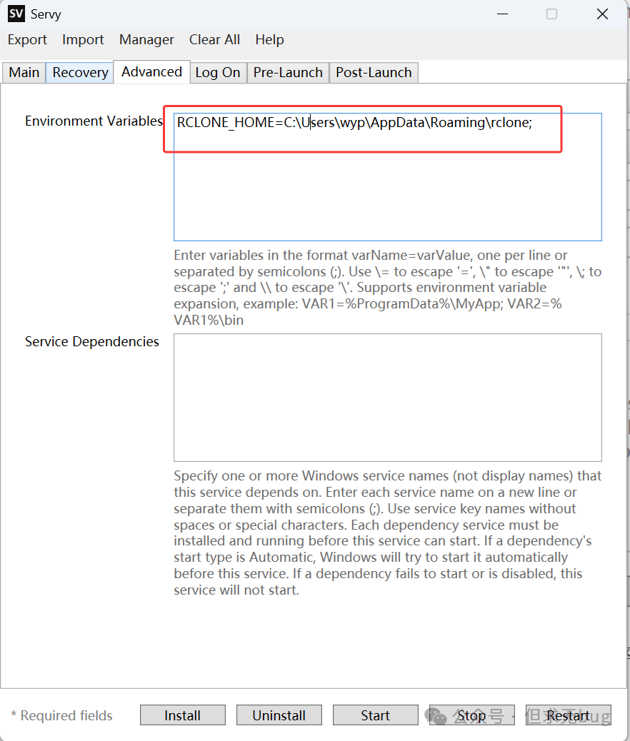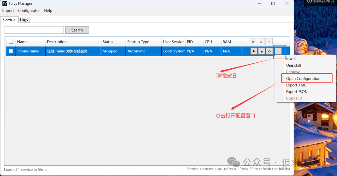 ![]() 下面还是以使用 RClone 挂载 minio 为例进行演示。 注册服务需用到 Servy 程序,其主界面如下所示: 各项参数的含义为: Service Name: Display Name: Service Description: Process Path: Startup Directory: Process Parameter: Startup Type: Process Priority: Stdout File Path: Stderr File Path: 在 Servy 中填写 RClone 挂载程序的结果如下所示: 可能有些会好奇,在 Process Parameters 中的 %RCLONE_HOME% 的作用,其实这只是引用我在 环境变量中设置的变量而已。该变量在 “Advanced”中进行了设置: 接着点击“Install” 进行安装,安装成功后会弹出如下提示信息 此时在打开的 Servy Manager 中按 F5 键刷新便能看到注册的 rclone-minio 服务: 此时打开 Windows 服务列表,发现已出现了 minio 服务: 在 Servy Manager 面板中点击对应服务的启动按钮即可进行启动: 点击后弹出如下启动成功的信息,且服务的状态也已由 “Stopped”变成了 “Running”: 此时在文件资源管理界面便能看到挂载的 minio : 关闭服务只需在 Servy Manager 管理页面点击如下关闭按钮即可 点击关闭按钮后,会弹出服务关闭信息,且该服务的状态也由“Running” 变成了 “Stopped”: 此时查看文件资源管理器,也发现挂载的磁盘已消失。 编辑服务只需在Servy Manager 管理页面中选择右侧的详情按钮,然后点击“Open Configuration”: 点击后便会弹出如下编辑窗口: 当然,刚确切说是填充了服务信息的创建窗口。编辑完毕后点击 “Install”再次安装即可。 卸载服务是在 Servy Manage 管理页面选择对应服务右侧的详情按钮后,点击“uninstall”便可进行卸载: 点击后会弹出卸载确认信息: 继续点击“是”便完成了卸载: 阅读原文:https://mp.weixin.qq.com/s/n2sgHYLBFnMmu4nXv9UCjg 该文章在 2026/1/20 10:58:27 编辑过 |