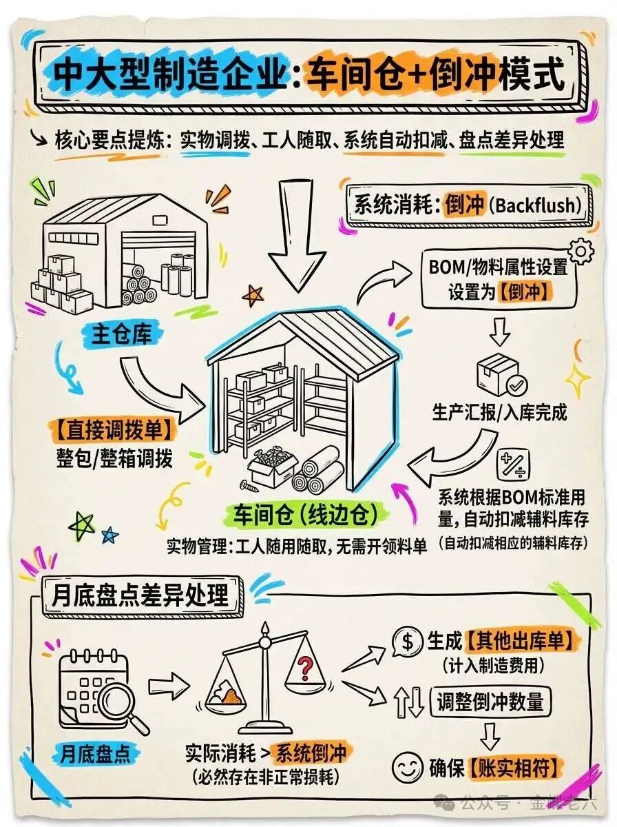 二:如果这部分物料在BOM中有体现一般有研发管理支撑的企业,在进行整体研发设计的时候,针对标准BOM(物料清单)的结构,通常会将这些辅料以准确的单耗(或包含损耗率的用量)列入BOM中。 这样做的好处显而易见:标准成本更准确,BOM结构更完整。 但在实际执行层面,如果不区分管控模式,直接按BOM跑MRP(物料需求计划)并生成辅料领料单,现场仓库管理员和车间统计员绝对会疯掉的。举例:难道领1000个螺丝还要一个个去数吗? 针对这种情况,在金蝶ERP实施中,我们通常推荐以下两种处理方案。 A:调拨+倒冲管理(最推荐)辅料在BOM中体现,并且会进行车间的一个实际发料,而且辅料不容易进行管理。 这是中大型制造企业最常用的模式。我们不在生产工单下达时直接触发领料,而是建立“车间仓”(或称线边仓)的概念。 实物管理: 仓库将整包、整箱的辅料(如一箱螺丝、一卷包材),通过【直接调拨单】调拨到“车间仓”。 车间工人随用随取,无需每次生产都开领料单。 系统消耗(倒冲): 在BOM或物料属性中,将该类物料设置为“倒冲”(Backflush)。 当生产汇报(或入库)完成时,系统根据BOM设定的标准用量,自动从“车间仓”扣减相应的辅料库存。 盘点差异处理: 由于辅料必然存在非正常损耗,系统倒冲扣减的数量往往少于实际消耗。 月底对“车间仓”进行盘点,将差异部分生成【其他出库单】(计入制造费用)或调整倒冲数量,确保账实相符。
