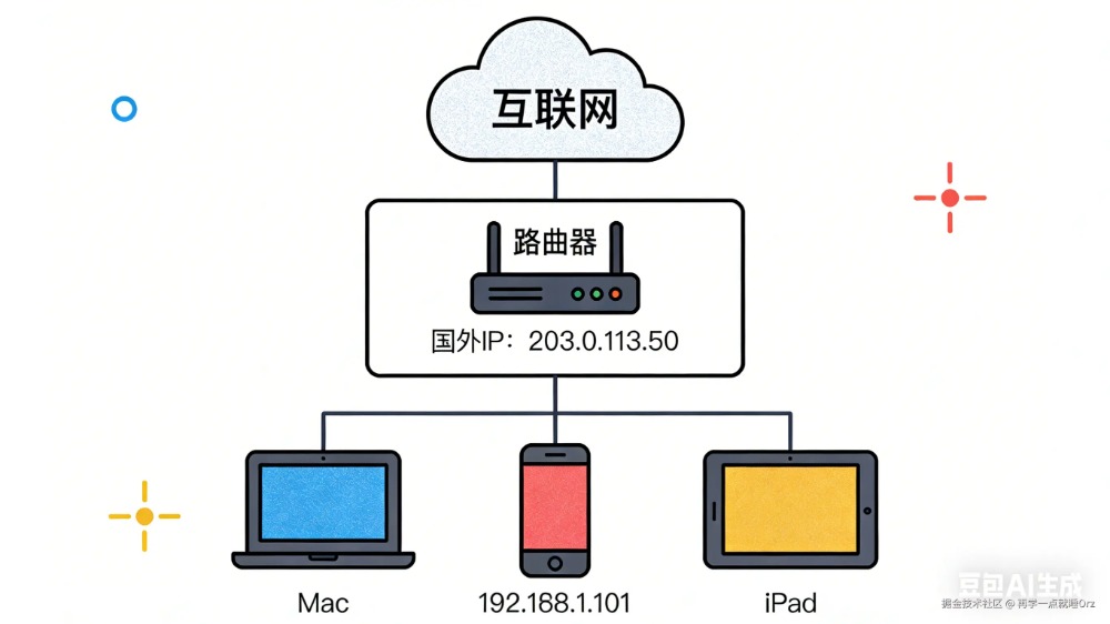 内网IP无法直接访问互联网,核心靠 NAT(网络地址转换) 技术,路由器充当“翻译官”的角色,流程如下: