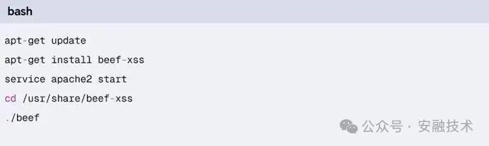 • 浏览器被钩住:当用户访问被篡改的页面时,浏览器会加载并执行hook.js,与 BeEF 服务端建立通信通道。BeEF 服务端默认监听 3000 端口。 • 控制浏览器:攻击者通过 BeEF 的控制台向被钩住的浏览器发送指令,执行各种攻击模块。例如,攻击者可以: • 窃取用户的 Cookie。 • 弹出恶意对话框。 • 重定向用户到钓鱼网站。 • 进行键盘记录。 • 扫描内网。 3、攻击示例 • 环境搭建: • 攻击机:Kali Linux,安装 BeEF 和 Apache2。 • 靶机:Windows 11,安装任意浏览器(如 Chrome 或 Edge)。 • 安装和启动 BeEF: