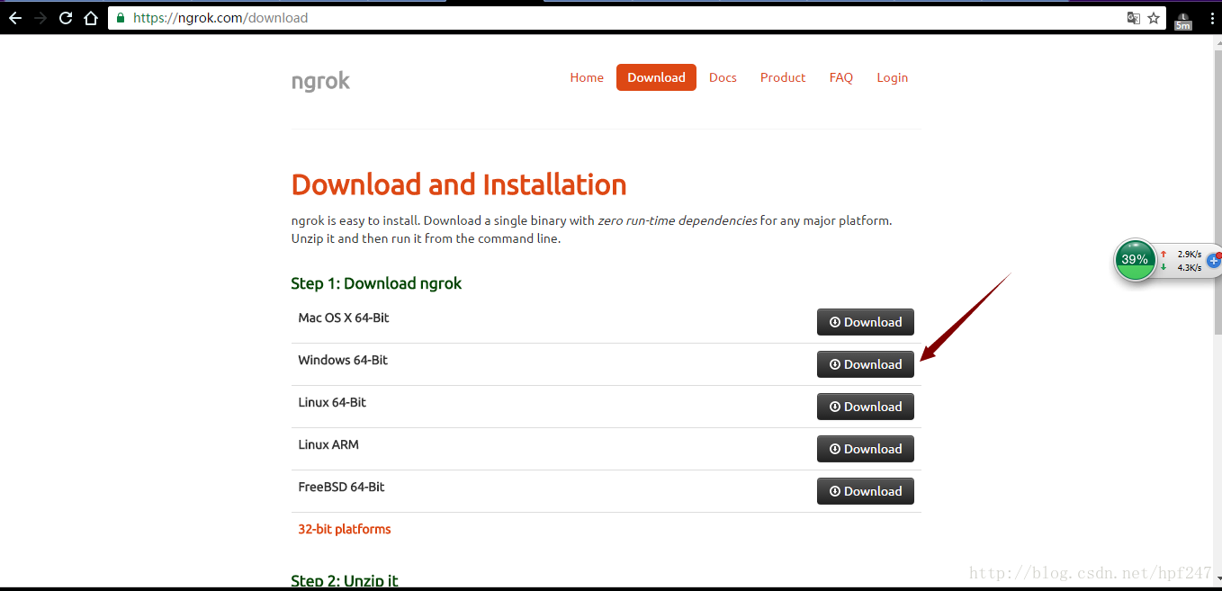 1、打开网站 https://ngrok.com/ ,在里面下载自己对应的版本号即可。