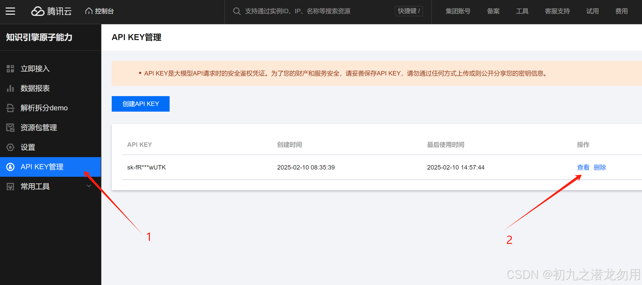 如图选择左侧“立即接入”菜单功能,选择 使用 OpenAI SDK方式接入,点击“创建 API KEY”按钮,按提示操作即可创建,创建成功如下图: