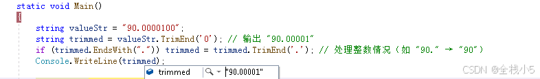 TrimEnd('0') | 字符串处理 | "90.0000100" → "90.00001" |