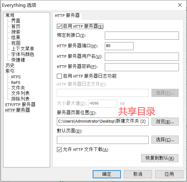 Everything 内置 ETP/FTP、HTTP 两种服务器,无需额外安装软件,即可快速实现文件共享与远程访问。下面重点介绍HTTP服务文件共享方法: