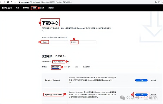 在群晖官网www.synology.cn下载中心找到相对应的产品型号,在桌面应用程序中下载Synology Drive Client这款软件进行安装(根据自己电脑系统下载对应的安装包)。