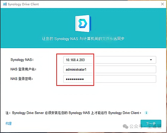 安装之后,在计算机上运行Synology Drive Client。输入Synology NAS的地址(IP、域名或QuickConnect ID)、用户名和密码进行连接。