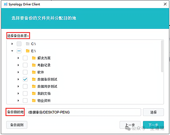 选择您的备份源(本地电脑端文件夹或盘符)和目的地(NAS端的团队文件夹)。您可以通过单击选择来更改目的地。