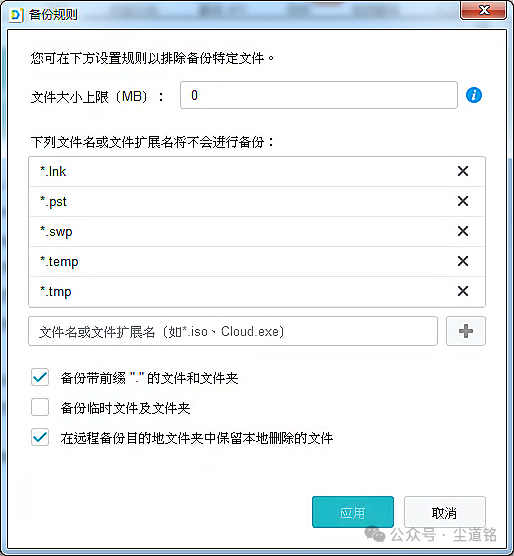 单击备份规则可以设置规则,用以排除不想备份的文件,例如文件大小上限、特定文件名或文件扩展名。