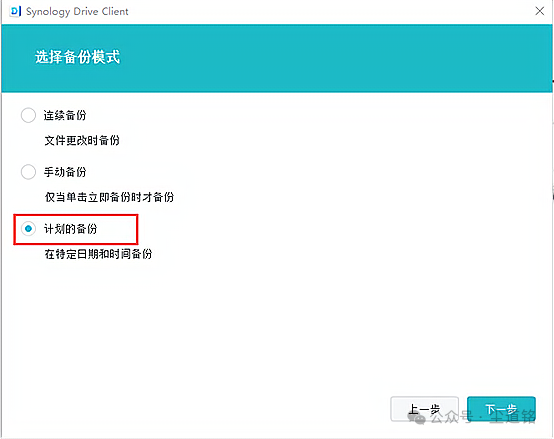在此示例中,我们将演示如何配置计划备份,因为这需要更多设置步骤。选择“计划的备份”单击下一步继续。