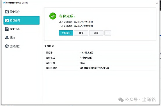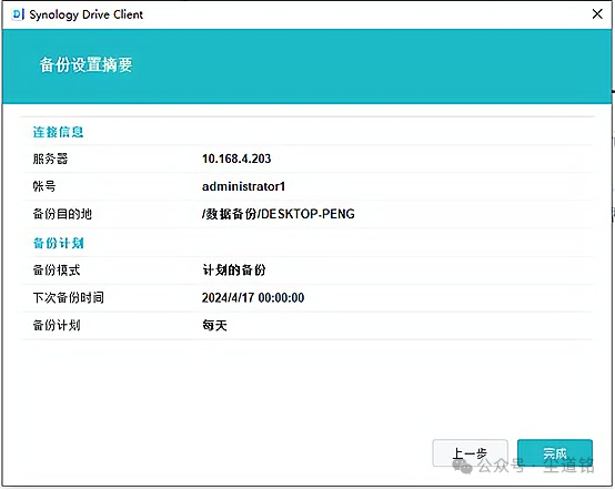 在向导的最后一步中,您将看到备份任务的摘要。单击完成,然后可以选择立即备份,完成后就可以看到Synology Drive Client的备份界面了。