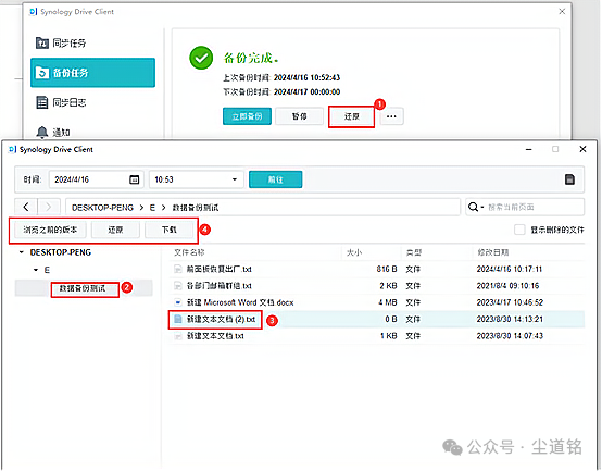 打开Synology Drive Client,进入备份任务并单击还原,可以下载或者还原Synology Drive服务器上同步文件的历史版本。